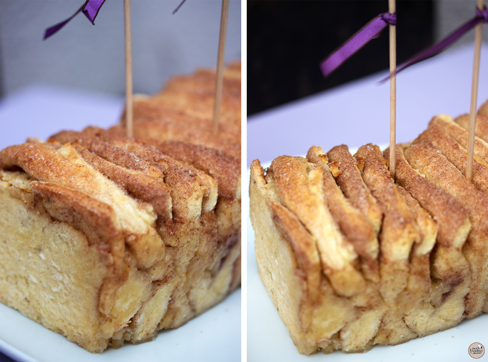 Der Apfel und das Marzipan war eine hervorragende Kombination zu dem Hefeteig. Alles in allem war nichts zu trocken oder sogar zu süß, im Gegenteil, es schmeckte wunderbar. Die Zimt-Zucker-Kruste ist das I-Tüpfelchen des Ganzen und ich verspreche Euch, Ihr wollt nicht so schnell aufhören mit dem Abziehen der einzelnen Hefescheibchen. Grins.